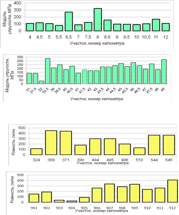 Результаты оценки ровности и модуля упругости по покрытию на отдельных участках эксплуатируемой дороги (рис. 1.3, 1.4) говорят о неравномерности транспортно-эксплуатационных характеристик дороги, запроектированной и построенной по единой конструктивной схеме на большом протяжении без учета индивидуальных особенностей отдельных участков. По данным отчета [107] модуль упругости на всем протяжении дороги меняется от 36 до 931 МПа. Проект реконструкции этой дороги был