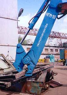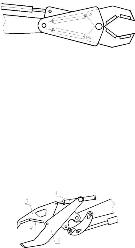 Ножницы выполнены в виде неподвижной (2) и подвижной (3) челюстей (см. рис. 5), соединенных шарнирно между собой. Подвижная часть снабжена гидроцилиндром (1). Режущие кромки челюстей снабжены сменными ножами (4). Предусмотрен вариант крепления гидравлических ножниц к стреле с помощью дополнительного промежуточного шарнирного соединения, обеспечивающего возможность поворота ножниц относительно продольной оси рукояти посредством дополнительного гидроцилиндра.