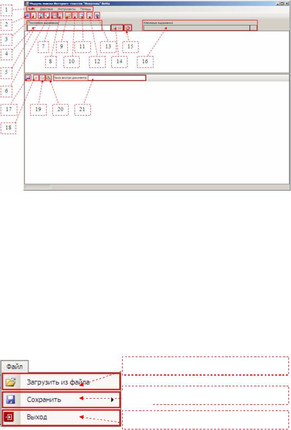 1 – меню модуля; 2 – выбор поиска в Google; 3 – выбор поиска в Yandex; 4 – строка ввода поискового запроса; 5 – исключать пустые ссылки; 6 – показывать пустые ссылки; 7 – показывать фрагмент строки, где найден поисковый запрос; 8 - показывать весь текст Интернет- -страницы; 9 – загрузить запрос из файла; 10 – сохранить найденные