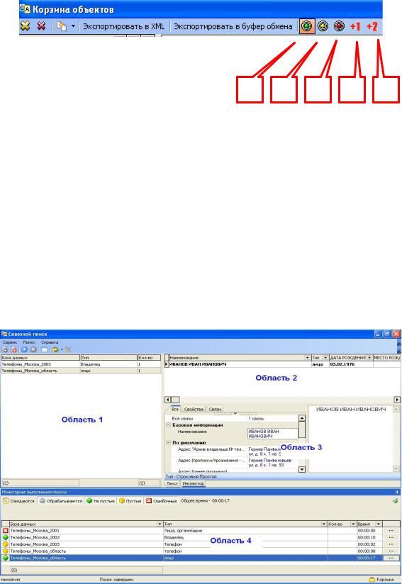 «Область 1» отображает процесс выполнения запроса среди всех заданных типов в базах, по которым осуществляется поиск. Эта