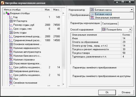 Нормализация полей проводится с цель преобразования данных к виду, подходящему для обработки средствами АП «Deductor». Например, при построении нейронной сети, линейной модели прогнозирования или самоорганизующихся карт «Входящие» данные