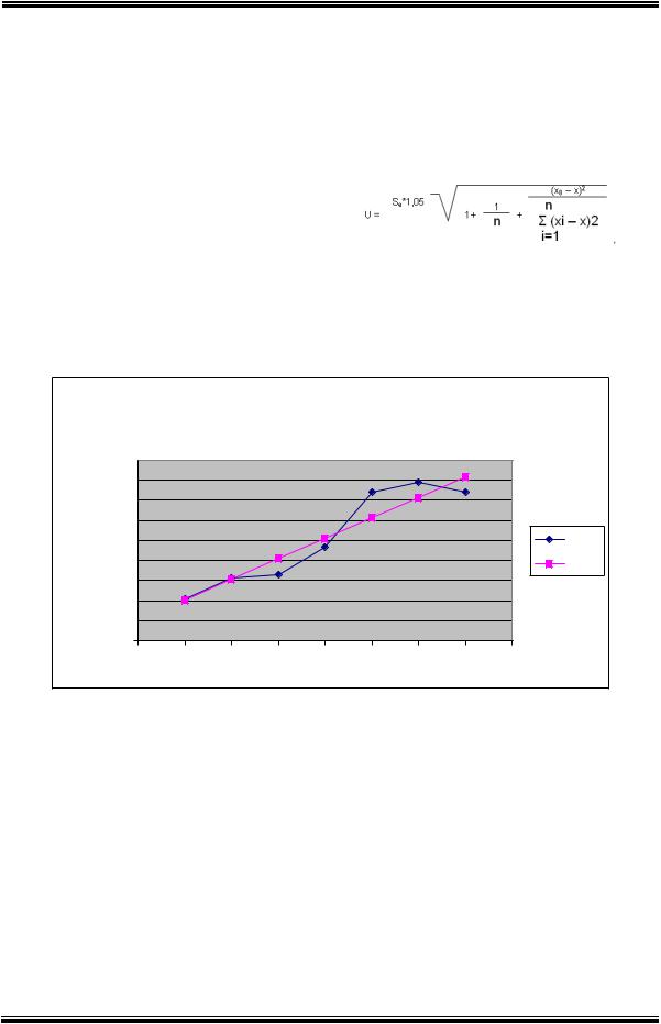 В таблице г = ei*ei-1/ ei2 = 0,32 – коэффициент корреляции. Подсчитанное значение коэффициента корреляции дополнительно подтверждает справедливость вывода статистики ДарбинаУотсона об адекватности модели. Табличные данные наглядно свидетельствуют о полной адекватности модели. Графическая иллюстрация модели представлена на рисунке 2: