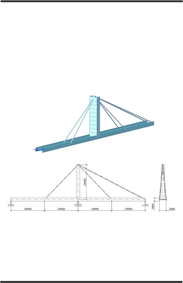 Рассмотрим конечно-элементную модель простейшей пространственной вантовой системы, изображенной на рисунках 1 и 2. Пространственная модель вантового моста состоит из пилона, балки и вант. Пилон смоделирован при помощи балочного конечного элемента. Призматический 3D балочный элемент определяют два узла. Каждый узел имеет три поступательные и три вращательные степени свободы. Элемент учитывает жесткость пилона на растяжение-сжатие, на изгиб, на сдвиг и на кручение. Пилон состоит из 10 таких элементов.