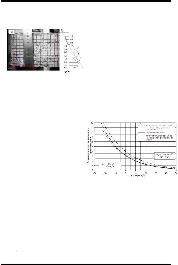 Рис. 2. Пример построения сетки для определения относительных деформаций (а); эпюра горизонтальных деформаций (б): 1 – эксперименталь-