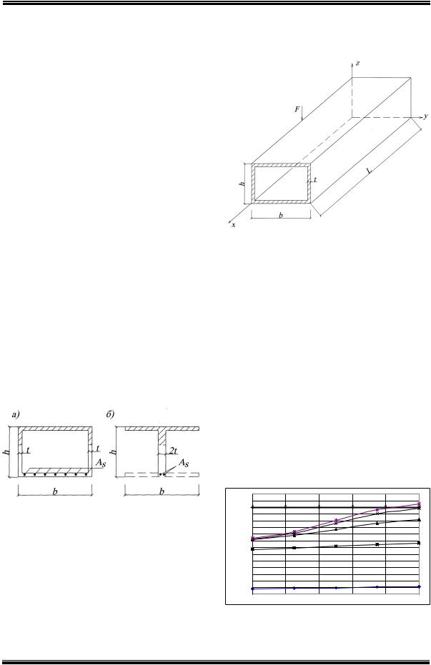 Отечественные и зарубежные нормы расчета [1-3] коробчатых элементов, работающих на изгиб с кручением, как правило, предполагают балочную схему работы конструкции. При этом в зависимости от граничных условий, одна полка полностью сжата, другая – полностью растянута. Тогда расчет коробчатого сечения сводится к расчету эквивалентного таврового сечения, полка в растянутой зоне во внимание не принимается, а вся арматура в растянутой полке является расчетной (рисунок 2).
