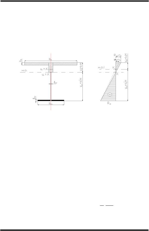 крайних фибр сечений соответственно. На эпюре нормальных напряжений, приведенной к стали, сплошной линией ограничены напряжения в середине пролета, а прерывистой линией - напряжения в i-том сечении пролета.