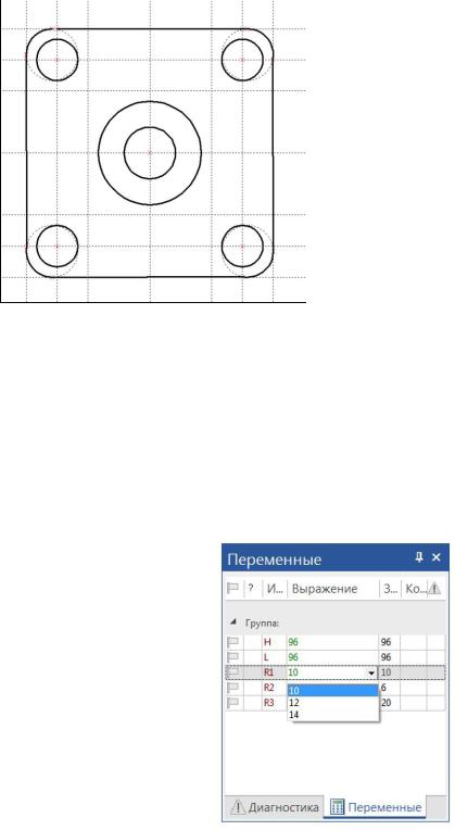 Постройте скругления: Чертеж → Построения → Окружность → Отметить ЛКМ две прямые, касательные к окружности → Параметры окружности → Радиус → Создать переменную R1 → окно Переменные → задать значение R1=10 (рис. 7.7).