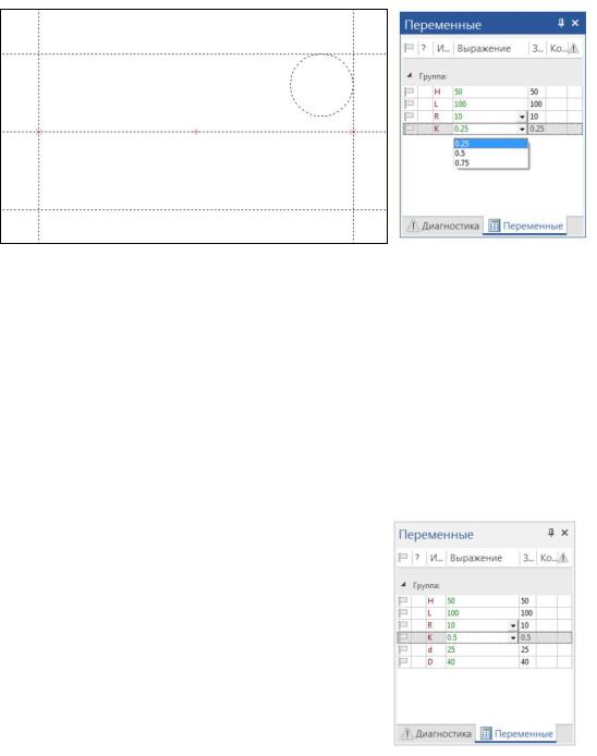 чение d=25. Постройте вторую окружность с центром в середине между узлами: Чертеж → Построения → Окружность → Параметры окружности → → Диаметр → Создать переменную D → окно Переменные → задать зна-