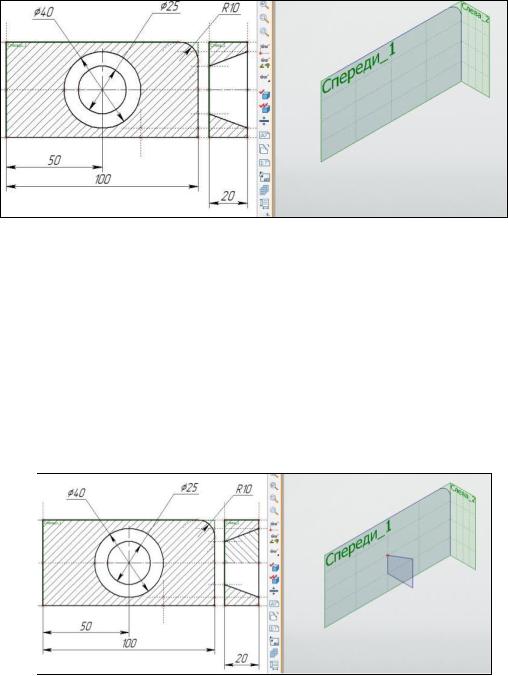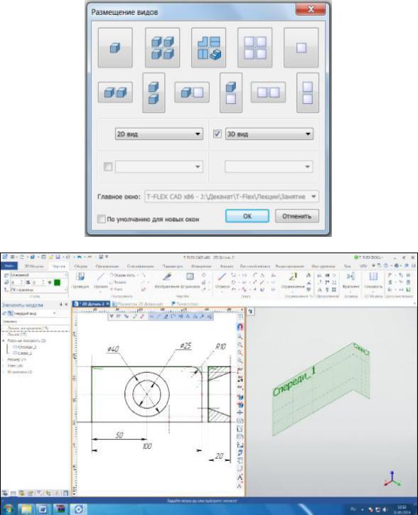 Аналогичные действия необходимо сделать для построения плоскости Вид слева. После создания двух рабочих плоскостей необходимо открыть окно 3D для просмотра. В Т-FLEX CAD для удобного просмотра есть возможность размещения в одном окне экрана 2D и 3D построений. Для этого необходимо нажать на рабочей панели инструментов справа