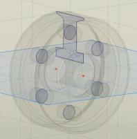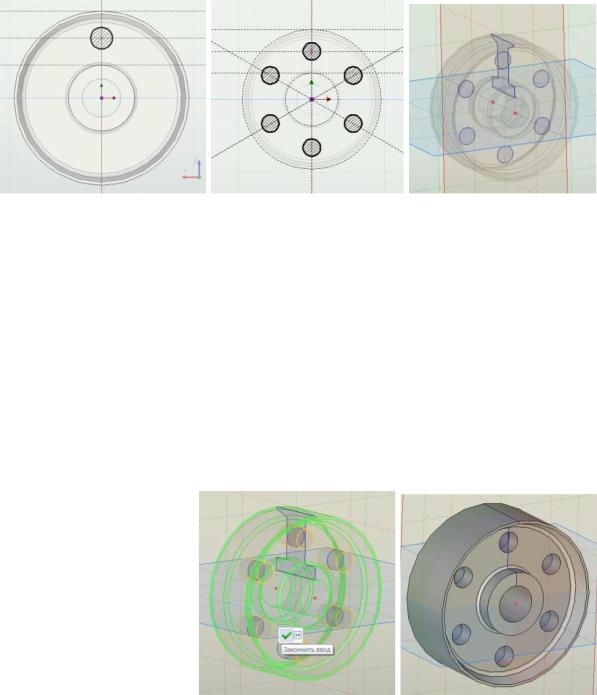 Далее необходимо выполнить вспомогательныеИпостроения на рабочей плоскости Вид слева: начертить две окружности радиусами 100 и 38, по середине между двумя окружностями построить 3D-профиль для отверстия радиусом, равным 25. Далее выполнить штриховку и завершить построения. Так как всего 6 отверстий, то нужно добавить еще пять 3Dпрофилей. Для этого воспользуемся следующей последовательностью команд: Чертеж → Дополнительно → Круговой массив → Выбрать 3Dпрофиль для отверстия → Выбрать центр детали → В параметрах операции выбрать количество копий 6, шаг 60º → Завершить построения