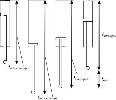 – минимальная длина отдельной гидравлической опоры, при которой обеспечивается условие отрыва пневматических ходовых элементов машины от грунта; lmax констр – максимальная длина отдельной гидравлической опоры, при которой шток выдвинут на максимально допустимую конструкцией гидроцилиндра длину; lmin пред – минимальная предельно допустимая длина отдельной опоры в рабочем режиме машины; lmax пред – максимальная предельно допустимая длина отдельной опоры в рабочем режиме машины (рис. 3.19).