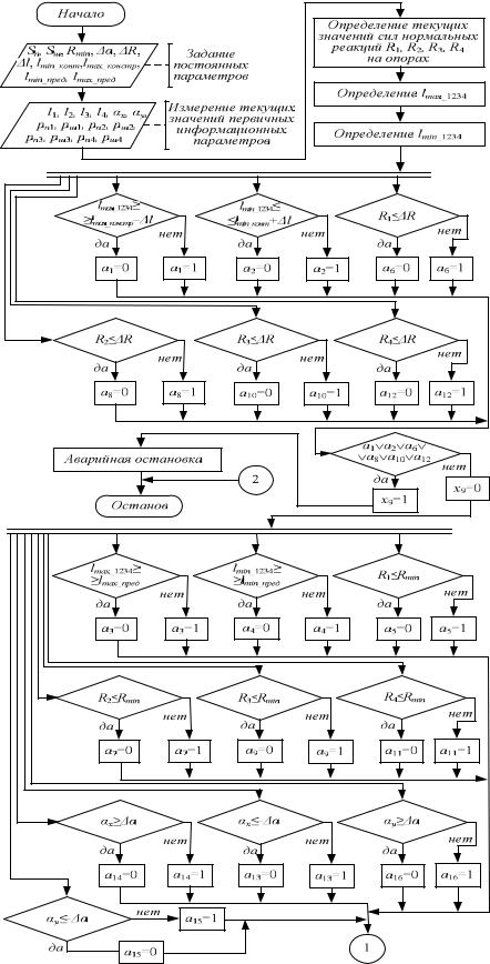 На рис. 3.20 приведена блок-схема алгоритма функционирования устройства управления положением платформы строительной машины. Алгоритм однотактный без необходимости хранения данных предыдущих тактов в памяти работает следующим образом. На основе текущих значений первичных информационных параметров рассчитываются силы нормальных реакций на опорах R1, R2, R3, R4, определяются максимальные и минимальные длины lmax 1234 и lmin 1234.