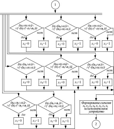 Затем полученные по (3.21) – (3.23) значения параметров сравниваются с константами, получаются промежуточные логические переменные со значениями 0 и 1, которые обрабатываются при помощи блоков логических операций. В результате получаются выходные переменные x1… x9, которые также принимают значения 0 и 1.