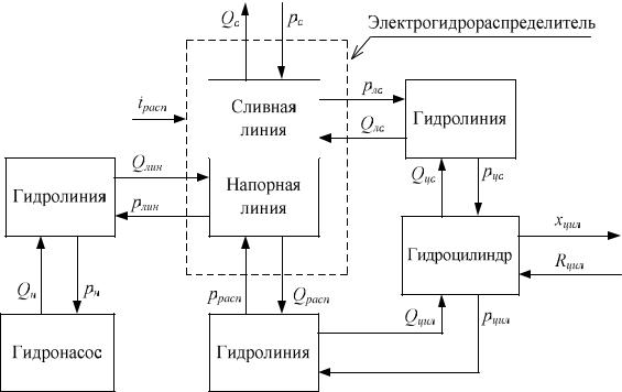 На схеме приняты следующие обозначения (см. рис. 3.23): Qн – подача на выходе из питающего насоса и на входе в гидролинию, соединяющую насос с гидрораспределителем; Qлин – расход на выходе из гидролинии и на входе в гидрораспределитель; Qраспр – расход на выходе из гидрораспределителя и на входе в гидролинию; Qцил – расход на выходе из гидролинии и на входе в гидроцилиндр; Qцс – расход на выходе из гидроцилиндра и на входе в гидролинию; Qлс – расход на выходе из сливной гидролинии цилиндра и на входе в сливную линию распределителя; Qc – расход на выходе из сливной линии распределителя и на входе в сливную линию гидробака; Rцил – усилие, приложенное к штоку исполнительного гидроцилиндра, обусловленное силами сопротивления подъему массы платформы; xцил – перемещение штока исполнительного гидроцилиндра; pн – давление питающего насоса; pлин – давление на входе в гидрораспределитель и на выходе из гидролинии; pрасп – давление на входе в гидролинию и на выходе из гидрораспределителя; pцил – давление на входе в исполнительный гидроцилиндр и на выходе из гидролинии; pцс – давление на входе в сливную гидролинию цилиндра и на выходе из гидроцилиндра; pлс – давление на выходе из сливной гидролинии цилиндра и на входе в сливную линию распределителя; pc – давление на выходе из сливной линии распределителя и на входе в сливную линию гидробака.