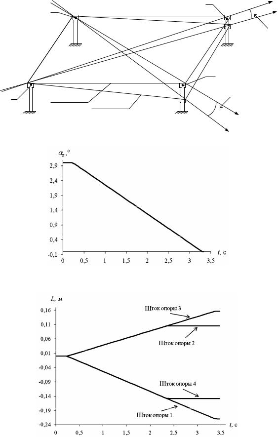 На рис. 3.38 представлен график переходного процесса работы системы. На графике показана зависимость изменения угла наклона платформы αz от времени. На рис. 3.39 представлен график переходного процесса работы всей системы. На графике показаны зависимости положений штоков гидроцилиндров опор от времени.
