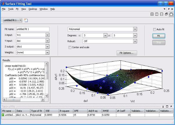 Для аппроксимации необходимо задать в рабочей области MATLAB массивы входных и выходных переменных. Затем посредством специальной команды (sftool) запустить инструмент «Surface Fitting». Результат аппроксимации выводится в рабочем окне инструмента в виде функции и массива значений коэффициентов регрессии, а также оценки достоверности найденной зависимости. В данной работе, исходя из коэффициента R2 принято решение об аппроксимации численных зависимостей αz от VВТЯГ и α полиномом 3-й степени, в общем случае описываемым уравнением [14]