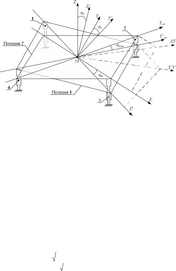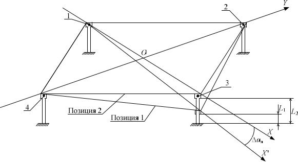 Цифрами 1, 2, 3, 4 показаны гидравлические опоры платформы (аутригеры); X, X′ и Y – диагональные оси, по которым измеряются углы наклона платформы относительно горизонта; L1 – начальная длина аутригера 3; L2 – конечная длина аутригера 3; αx – изменение угла наклона по диагональной оси X. При выдвижении штока гидроцилиндра аутригера 3 платформа меняет свое пространственное положение (Позиция 1 → Позиция 2), это приводит к изменению угла наклона по оси X.