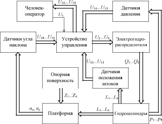 На рис. 3.4 представлена блок-схема процесса управления положением платформы строительной машины [10, 11, 29]. Основным элементом системы является устройство управления (УУ). Для включения системы человек-оператор подает управляющий сигнал U1 на УУ.