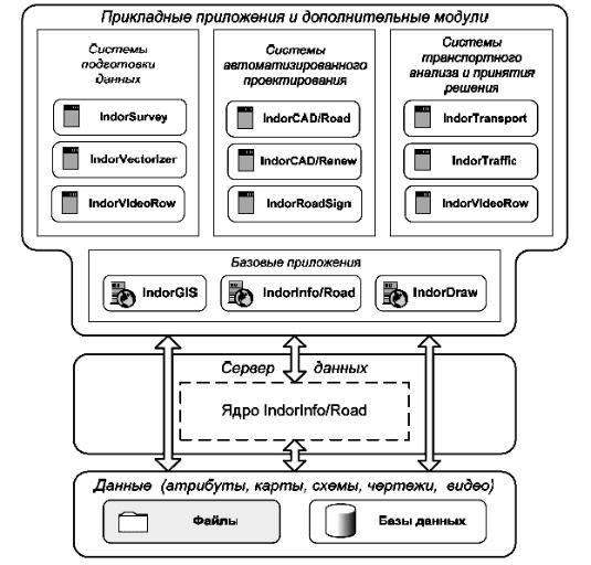 Важнейшими базовыми компонентами геоинформационной системы автомобильных дорог IndorGIS/Road являются ГИС IndorGIS и информационная система Indorlnfo/Road, которые взаимно дополняют друг друга в управлении графической и атрибутивной информацией. Вокруг этих систем организовано всё взаимодействие с другими