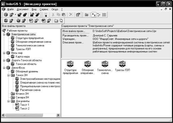 После запуска системы IndorGIS открывается окно менеджера проектов (рис. 9.2). Оно предназначено для управления всеми рабочими документами, такими как проекты, карты, текстовые документы, объекты OLE, растровые изображения, интерфейсы с базами данных.