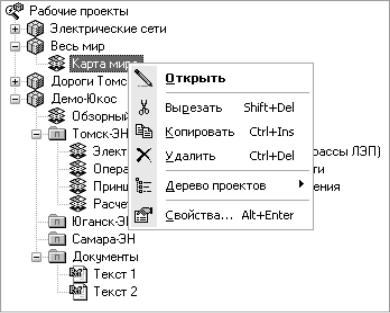 В левой части окна расположено "дерево" проектов. Оно содержит все текущие рабочие проекты. Каждому проекту соответствует отдельная ветвь "дерева". Чтобы увидеть состав проекта, нужно нажать на знак «+», расположенный рядом с названием проекта. В каждой ветви "дерева" отображаются все карты, текстовые документы и