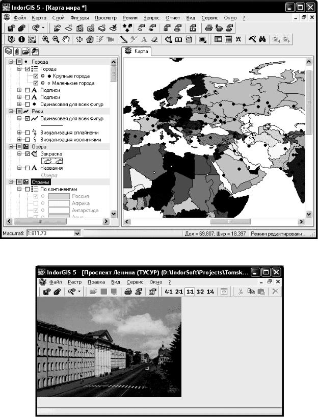 Редактор карт содержит инструменты для создания и редактирования карт, текстовый редактор – инструменты форматирования текста, растровый редактор предоставляет возможности для редактирования растровых изображений. В центре окна любого редактора находится область просмотра и редактирования документа (рис. 9.6, 9.7).