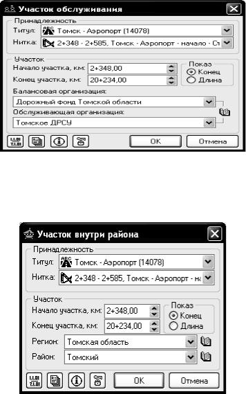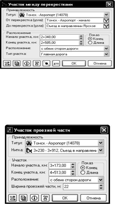 появляется окно (рис. 10.4). В верхней части указывается принадлежность участка к титулу (заполняется автоматически) и к нитке – участку между перекрестками или съезду. Далее идет информация по расположению участка – началу и концу либо началу и длине. Затем располагается информация, специфичная для данного вида участков: балансовая организация (балансодержатель данного участка дороги) и обслуживающая организация.