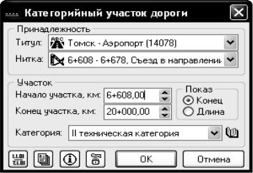 Участки категории дороги. При вызове участка на редактирование появляется окно (рис. 10.6). В верхней части указывается принадлежность участка к титулу (заполняется автоматически) и к нитке. Далее идет информация по расположению участка – началу и концу либо началу и длине. Затем располагается информация, специфичная для данного вида участков техническая категория, которую имеет данный участок.