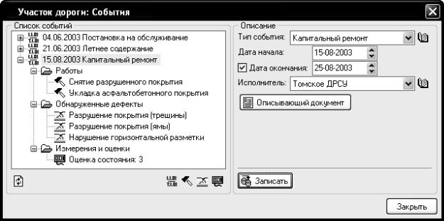 Рис. 10.12. Окно редактирования информации по событиям, работам, дефектам и измерениям