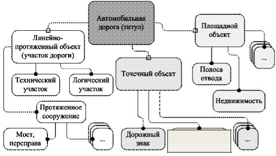 Автомобильная дорога состоит из объектов трех видов: протяженных (участков), точечных и площадных. Под участком или объектом будем понимать такое сооружение или протяженный фрагмент дороги, логический или технический, который исполняет определенный набор функций либо представляется в определенном качестве, может фигурировать в этом качестве как единое целое и при этом может быть целиком заменен на аналогичный. Необходимым требованием к участку и объекту является его необходимость с информа- ционно-аналитической точки зрения. Так, например, в ряде практических случаев представляется важным рассматривать такие мелкие объекты, как слои дорожной одежды, детали пролета моста, а в ряде случаев – нет.