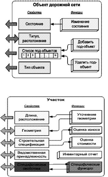Мы уже выделили примерную структуру объектной иерархии и теперь можем привести общие положения по разделению конкретных сущностей по этим классам. Начиная с самого верха, выделим абстрактный объект дорожной сети. Самыми общими его чертами будут: принадлежность титулу, расположение, тип (принадлежность к тому или иному виду сущностей), состояние. Набор возможных состояний будет расширяться по мере конкретизации описания объекта, используя список объектов, находящихся в его составе. Самыми общими функциями будут: изменение состояния объекта, добавление нового объекта в состав данного, исключение определенного объекта из состава (рис. 10.21).