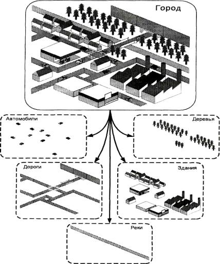 На рис. 3.1 представлен пример городской застройки, на которой изображены жилые дома, фабрики, заправки, склады, различные автомобили, лесопарковая зона, река, улица, мост, тоннель. Для геоинформационной системы создаются 5 основных слоев: