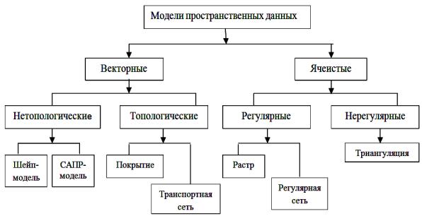 Модель данных – способ описания однотипных пространственных объектов, включающий способ описания отдельных объектов, топологических отношений между ними, а также дополнительных знаний о всей совокупности объектов в модели. Все множество моделей пространственных данных делится на две большие группы (см.