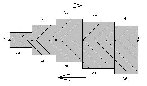 Для определения количества автобусов необходимо исходить из максимального по величине и направлению пассажиропотока (Qmax) по данному маршруту. Так, для маршрута АВ (см. схему) при расчете количества автобусов часовой пассажиропоток принимается равный Q3, так как это наибольшая величина в прямом и обратном направлении. Если известна средняя величина пассажиропотока Qср, то для расчета количества автобусов её следует принять с поправкой на коэффициент неравномерности ηн . В этом случае количество автобусов будет равно: