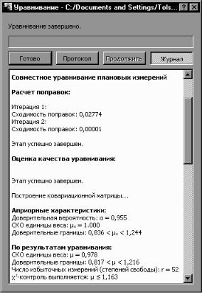 Впроцессе выполнения расчета на экран выводится панель монитора уравнивания, на которой отображается номер текущей итерации и величина сходимости итераций, равная среднему квадратическому значению поправок в координаты пунктов на предыдущей итерации. По завершении этапа в мониторе выводятся априорные и полученные статистические характеристики.
