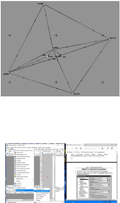 На практическом примере рассмотрим технологию совместной обработки результатов измерений c использованием различных видов исходных данных: измерений, полученных из электронных тахеометров и данных постобработки спутниковых измерений. При выполнении уравнительных вычислений кратко описана последовательность действий при поэтапном и совместном уравнивании. Схема геодезической сети показана на рис. 26.