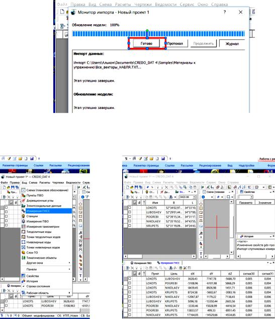 В результате успешного импорта данных (рис. 33) будут заполнены таблицы окон «Эллипсоидальные данные» и «Измерения ГНСС». Открываем их (рис. 34 и 35).