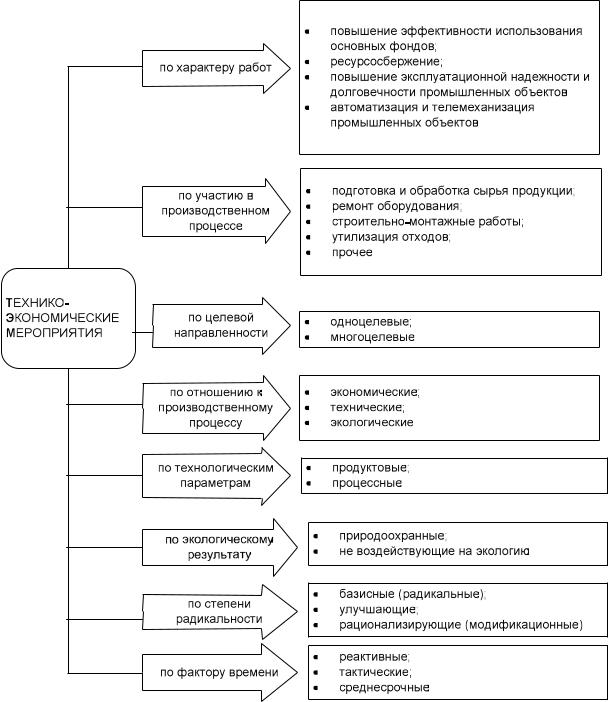 Все множество технико-экономических мероприятий в сфере промышленного производства можно классифицировать в зависимости от характера работ, области производственной деятельности; целевой направленности, отношения к производственному процессу, технологических параметров, экологических параметров, степени радикальности и причин возникновения (рис. 3.1).