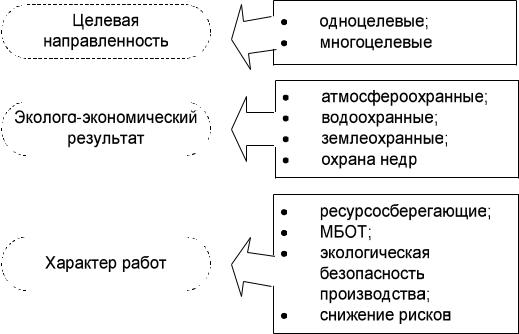 На отдельном предприятии природоохранный эффект может быть достигнут как результат проведения одноцелевых природоохранных мероприятий, которые направлены исключительно на снижение загрязнения окружающей среды. Многоцелевые природоохранные мероприятия направлены как на снижение загрязнения окружающей среды, так и на улучшение производственной деятельности и снижение технических рисков [4, 15].