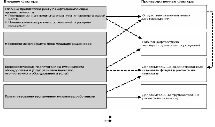 Другая проблема отрасли – недостаточное освоение новых месторождений. С 1990 по 2004 гг. в целом по России объемы поисковоразведочного бурения уменьшились в 4,7 раза, а эксплуатационного – в 3,8 раз [83]. Причинно-следственные связи между внешними факторами и факторами уровня процесса производства обобщены на рис. 4.14.