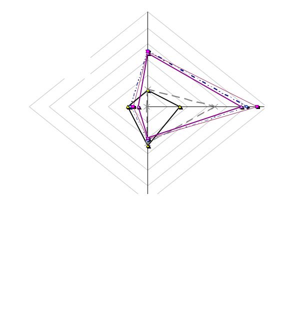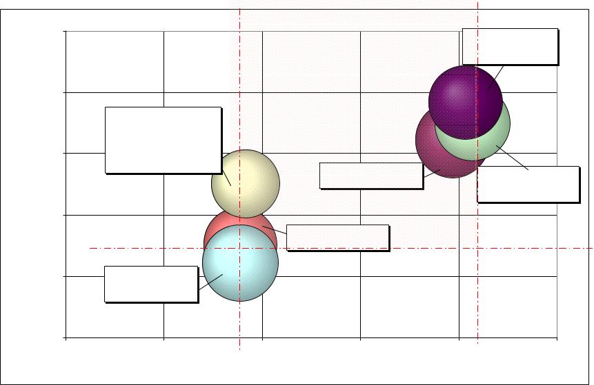 В правой верхней четверти диаграммы находится область, попадая в которую программа повышения эффективности становится привлекательнее базовой. В эту область попадают программы, сформированные по критерию максимизации экономического, технологического эффектов и равнозначности критериев. Заметим, что программа по принципу максимизации экономического эффекта, является более эффективной и при этом требует меньших вложений по сравнению тремя проектами, попавшими в оптимальную область.