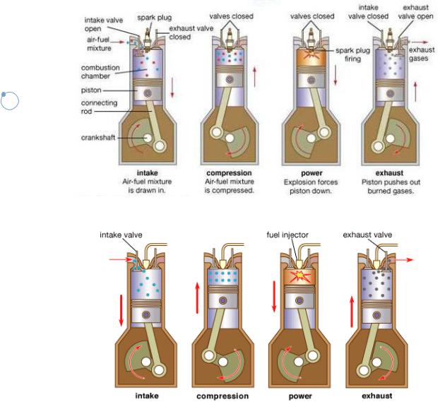 All motor vehicles have an engine. There are two types of engine. There are petrol engines and there are diesel engines. There are three engines in the picture. There is a 2-stroke petrol engine on the top of the page. There is a 4-stroke petrol engine in the middle and there is a 4-stroke diesel engine on the bottom of the page (fig. 5.1 – 5.3.).