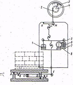 важелів другого роду. Маса вантажу в точках С і Д передається на платформенні гироприймальні важелі, в точці L – на проміжний важіль другого роду KM і в точці М – на тягу циферблатного покажчика, яка закінчується зубчастою рейкою 2, зчепленою з шестернею 4. На осі цієї шестерні закріплена стрілка, яка показує результат зважування. Для гасіння коливань стрілки на траверсі влаштований спеціальний заспокоювач 1. При зважуванні вантажів масою більше 500кг використовується накладна гиря 6, яка опускається на гиротримач 7 за допомогою механізму 5. Зубчасте колесо 8 на валику цього механізму зв’язане із зубчастою рейкою, закріпленою на гирі 6.