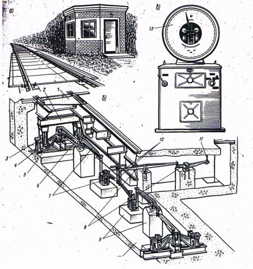 Рис. 2.49 Вагонні важільні ваги з циферблатним покажчиком вантажопідйомністю 150т: а – вагова будка; б – механізм ваг, розміщений в котловані;