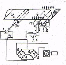 Фрикційний ролик РФ через тахогенератор Т передає в схему моста М інформацію про швидкість руху стрічки конвеєра, а лічильно-вимірювальний ролик РС – про навантаження, сприйняте датчиками Д. Дротяні тензометри наклеєні на пружну балку Б і зібрані за диференціальною схемою. Оскільки електрична напруга генератора Uт пропорціональна погонному навантаженню q, а число обертів – швидкості руху конвеєра V, лічильник безперервно накопичує суму ваги вантажу, що переміщується конвеєром.