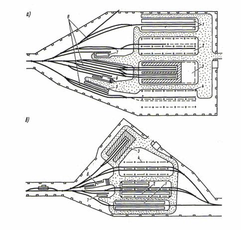 ав стиснених умовах – тупикового типу з паралельним розміщенням виставочних колій. Вибір тієї чи іншої схеми залежить від місцевих умов і обґрунтовується техніко-економічними розрахунками.