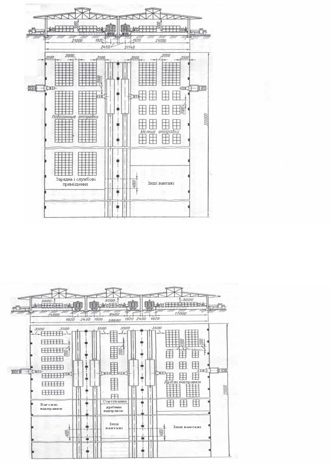 Рис. 2.9 Двопрогоновий ангарний склад для штабельного зберігання тарно-штучних вантажів за вантажопереробки біля 50 вагонів за добу
