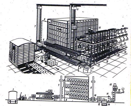 На промислових підприємствах в складах стелажного типу часто використовують гравітаційні або приводні накопичувачі, які можуть переробляти широку номенклатуру штучних вантажів. Принципи їх роботи приведені на рис. 2.12. Із вагона 1 вилочним електронавантажувачем 2 пакет вантажу 3 подається на підйомний стіл 4. Далі він потрапляє на один із накопичувальних конвеєрів 5, а з них на приймальний стіл 6. Кран-штабелер 7 розміщує пакет на одній із полиць гравітаційних стелажів 8. Із протилежного боку кран-штабелер 9 знімає пакет і передає його на розпакувальну машину 10, обладнану маніпулятором 11. Штучні вантажі з пакета прямують стрічковим конвеєром 12 в контейнер 13 або на роликовий конвеєр 14. Контейнери через накопичувач 15 прямують на підвісний конвеєр-штовхач 16. Стрічковий і роликовий конвеєри передають вантажі в секцію відправлення. Всі операції виконуються автоматично у відповідності з програмою, заданою оператором на пульті 17.