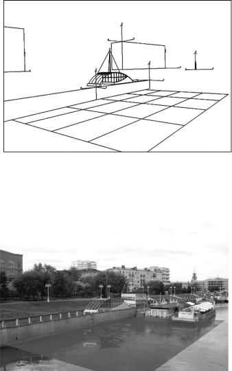 Задание: с использованием утилиты «Camera Match» создать вид из камеры, соответствующий фотографии набережной, разместить модель нового павильона рядом с существующими кассами, настроить дневное освещение сцены, отрендерить изображение павильона с отражением в воде, совместить с исходной фотографией и отредактировать полученное изображение в программе Adobe Photoshop.
