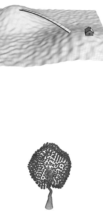 Построить примитив «Box» 150х6,0х1,0 м. Применить модификатор «Bend», задать параметр «Angle» около 30°. Разместить полученную фигуру между холмами в качестве моста между ними.
